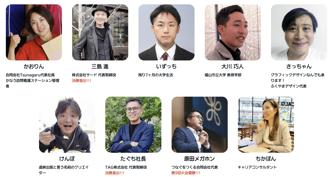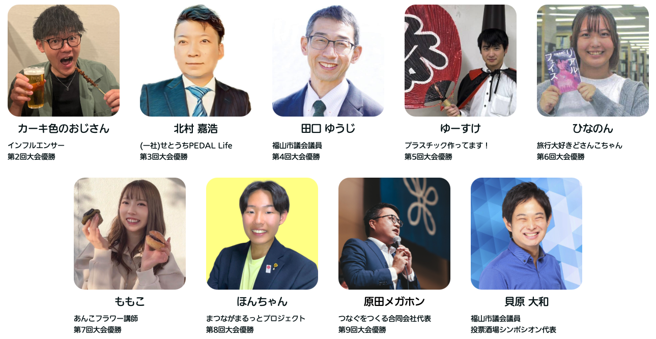 第2回から第9回の歴代優勝者と主催の貝原大和の9名が出場します。 ※第1回大会の優勝者は外せない予定により出場が叶いませんでした。 |